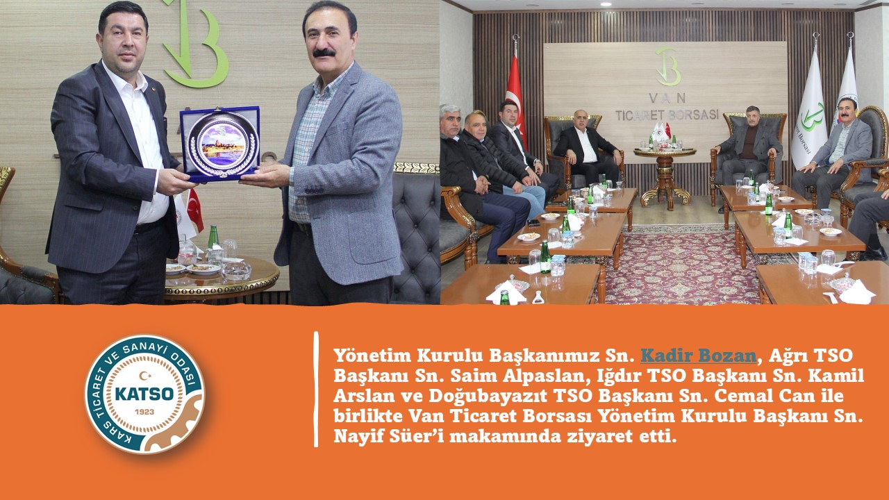 Yönetim Kurulu Başkanımız Sn. Kadir Bozan, Ağrı TSO Başkanı Sn. Saim Alpaslan, Iğdır TSO Başkanı Sn. Kamil Arslan ve Doğubayazıt TSO Başkanı Sn. Cemal Can ile birlikte Van Ticaret Borsası Yönetim Kurulu Başkanı Sn. Nayif Süer’i makamında ziyaret etti.