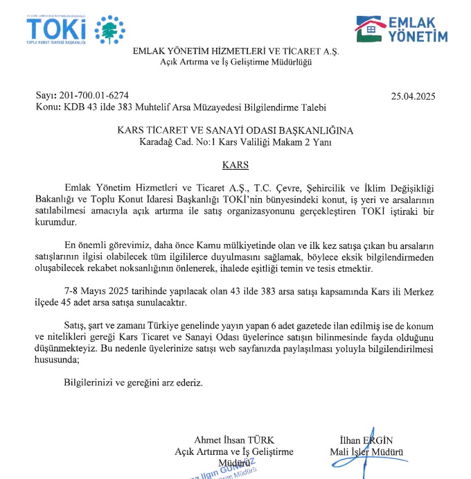 Emlak Yönetim A.Ş. tarafından 7-8 Mayıs 2025 tarihlerinde 43 ilde düzenlenecek açık artırma kapsamında, Kars ili Merkez ve ilçe sınırlarında toplam 45 adet arsa satışa sunulacaktır.